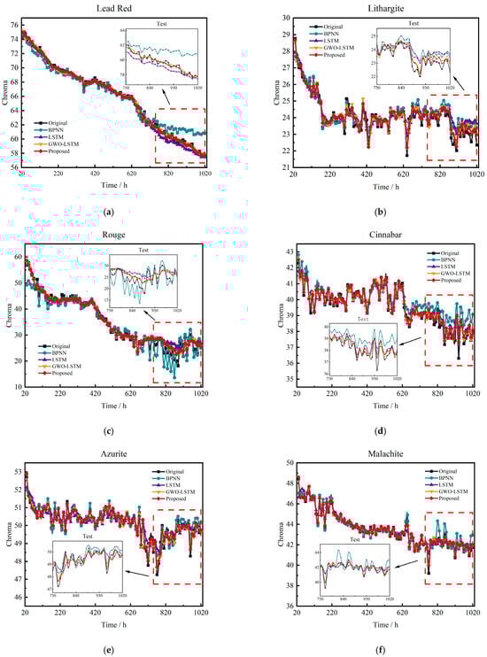 Comparison of the six pigments predicted chroma (C). Lead red (a), lighargite (b), rouge (c), cinnabar (d), azurite (e), and malalchite (f), respectively. (The subfigure shows the prediction results for the test set from 750 h to 1020 h).