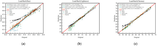 In summary, as shown in Figure 13 and Figure 14, taking lead red as an example, the results predicted by the BPNN model and LSTM model for the six pigments’ hLC optical change deviated from the actual results, and the prediction effect was gradually worsened as the time series increased; the GWO-LSTM model was slightly worse in the prediction accuracy and had the above phenomenon of gradually increasing prediction error; however, our proposed GWOAD-LSTM model had a larger overlap with the actual values in both training data and prediction data, the prediction effect was more ideal, and no phenomenon of the prediction effect becoming worse as the time series increased was observed. These were apparent advantages.