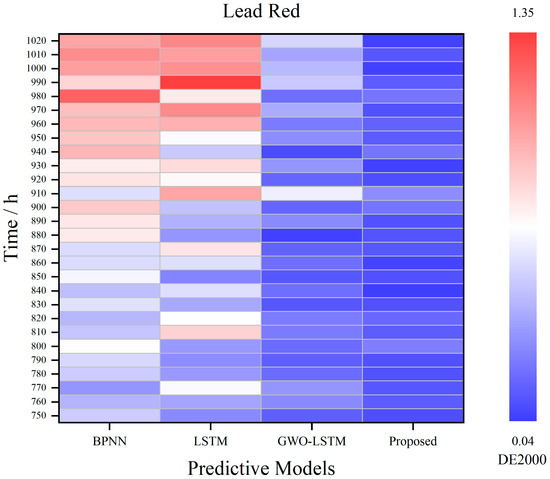 From the scatter plot analysis, the BPNN model had poor data capturing accuracy, the LSTM model exhibited weak data fitting amplitude, and the GWO-LSTM model showed low prediction accuracy in the peak. However, our GWOAD-LSTM model outperformed the other three models in terms of the above aspects. In particular, when applied to light-sensitive pigments, such as lead red, lithargite, and rouge, our GWOAD-LSTM model demonstrated superior prediction accuracy and generalization capability when compared to the BPNN, LSTM, and GWO-LSTM models. Additionally, the GWOAD-LSTM model slightly outperformed the other three models in the prediction accuracy for cinnabar, azurite, and malachite pigments, which had slighter hLC variations, where the color variations were relatively smaller. Therefore, our proposed GWOAD-LSTM model exhibited higher prediction accuracy and better generalization ability, particularly for pigments with larger color variations.