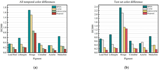 In summary, red and yellow pigments were prone to chemical reactions and physical structure changes due to prolonged light irradiation, resulting in much more complex color appearance changes and larger data fluctuations compared to the cyan pigments. Figure 15a shows the average color difference comparison of all models across the entire time series. In terms of overall color difference comparison, especially for light-sensitive pigments, the GWOAD-LSTM model had better fitting long-term trends and more accurate data capture compared to the BPNN, LSTM, and GWO-LSTM models. As shown in Figure 15b, the GWOAD-LSTM model had the smallest color difference and outperformed the previous three models in terms of color gamut prediction, indicating that our proposed model could effectively handle short-term data fluctuations and had higher prediction accuracy. At the same time, there were many factors, such as noise, in the original data, which caused the GWOAD-LSTM composite model to predict the effect of pigment fading with a slight error from the real value, but the overall prediction accuracy was better. Therefore, our proposed GWOAD-LSTM model was feasible in the field of practical pigment fading simulation prediction and rare painting restoration.