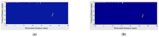 In Figure 10, the gray-white area represents the non-defect area, yellow represents the defect edge area, and red represents the defect core area. Finally, the minimum rectangle method is used to analyze the image defect characteristics combined with the welding process. The feature analysis results are shown in Table 2. In order to highlight the defect characteristics of the TFM image and avoid the interference of artifacts of adjacent contact surfaces, according to the and the in Table 1, the vertical coordinate of the defect location needs to be reduced by 11.7 mm.