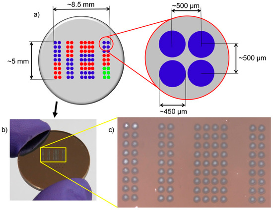 A demonstration label containing covert code within a visible barcode. (a) The schematic label design, with the color representing the polarization of the laser beam used to write the spot. Blue—right-circular polarization; red—left-circular polarization; green—linear polarization. (b) The label in a sample of GST film on the LiF substrate disk. (c) Enlarged barcode observed with unpolarized white light.