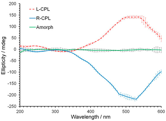 Circular dichroism spectra of spots from a sample label prepared using left- (L-CPL) and right (R-CPL)-circularly polarized light and an as-deposited film (Amorph). The error bars are five times the standard deviations computed from three repeated scans.