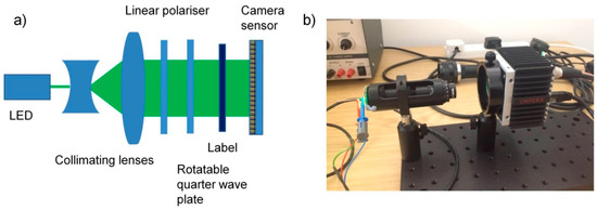 The reader consists of a green LED (~520 nm) as a light source, collimating optics to illuminate an area of approximately 1 cm2, a linear polarizer and a rotatable quarter-waveplate, a sample holder and a camera (12 bit, 1000 × 1000 pixels, 0.49 cm2 area sensor).