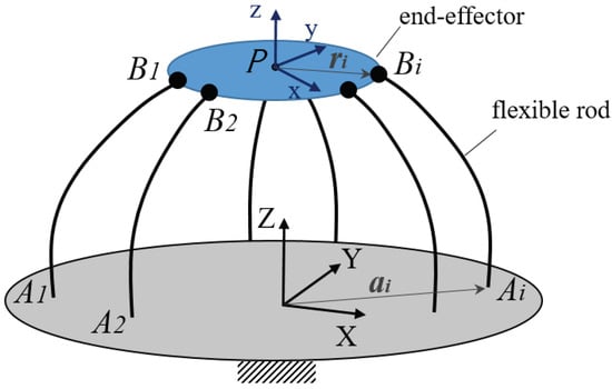 Let us consider now a parallel mechanism of flexible rods (see Figure 2), where a rigid end-effector is connected to N flexible rods , controlled by some actuators. By attaching a moving frame to the end-effector at reference point , its orientation can be defined either using a rotation matrix or a unit quaternion . The position vector of the rods’ attachment-points expressed in the end-effector frame is . The position vector of the rods’ proximal-ends expressed in the fixed frame is .