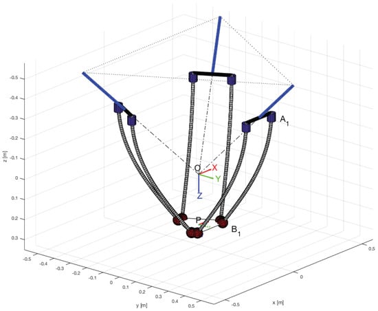 The location of the proximal ends of each rod is defined with the three actuators’ inputs; the clamping is vertical ; guess values for , are taken from the previous known pose, as well as those previous pose parameters and ; a load is defined, and the numerical minimization of residuals is performed with the guess vector in (20) and the Jacobian (22). Iteratively, we ultimately obtain the end-effector’s pose (, ) and the rods’ deformed shape.