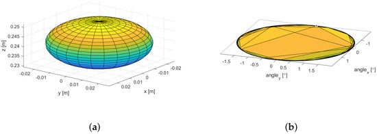 In a 3 degrees of freedom mechanism like the flexible Keops-Delta under study, the translational Jacobian can be used to obtain an ellipsoid that shows the three possible translational motions, as shown in Figure 4a. Similarly, for the rotation, can be used to get the rotational ellipsoid, depicted in Figure 4b, which clearly shows the predominant directions of rotation with respect to the X and Y axes, the rotation with respect to the vertical axis Z being almost zero.