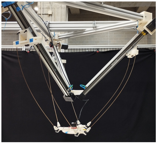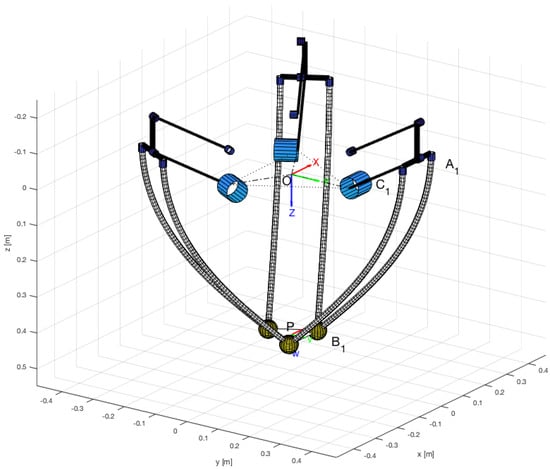 In the field of rigid parallel manipulators, the family of translational parallel manipulators is noteworthy. The best known example of this class of robots is the Delta manipulator [13,14,15,16]. The main applications of Delta manipulators are pick-and-place operations [17], packaging of small products (cosmetics, pharmaceutical industry, etc.) [18], high precision assembly operations [6], 3D printers [19] and haptic devices [20]. The Delta robot belongs to the family of lower-mobility parallel manipulators that can be defined as closed-loop spatial mechanisms whose end-effector has only three degrees of freedom controlled by actuation on three identical kinematic chains [21]. This type of rigid-body mechanism is subjected to geometrical constraints produced by the arrangement and morphology of the passive kinematic pairs, making it independent of the actuators’ values. In some cases, those geometric constraints fix some output parameters, as is the case of the Delta manipulator, which has fixed orientation parameters, resulting in a pure translational motion.