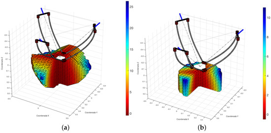 Figure 6 shows the workspace corresponding to the Delta rotational flexible manipulator. On the one hand, in Figure 6a, we can see the workspace resulting from imposing a limitation on the actuation system, given in this case by the rotational motors and the range of motion allowed by the articulated parallelogram connecting the motors to the clamping element of the proximal points . The colour scale is based on the value of the parasitic angle of the moving platform, the zones in red being the ones associated with the lowest values. On the other hand, by restricting the maximum parasitic angle to , the practical operational workspace of the flexible rotational delta is obtained in Figure 6b. It can be seen how it constitutes a fairly cylindrical workspace, whose central zone has very small values of the parasite angle (even less than if we keep within a radius of action of 0.2 m), while the peripheral zones have a greater angle of inclination, reaching in the blue extremes.