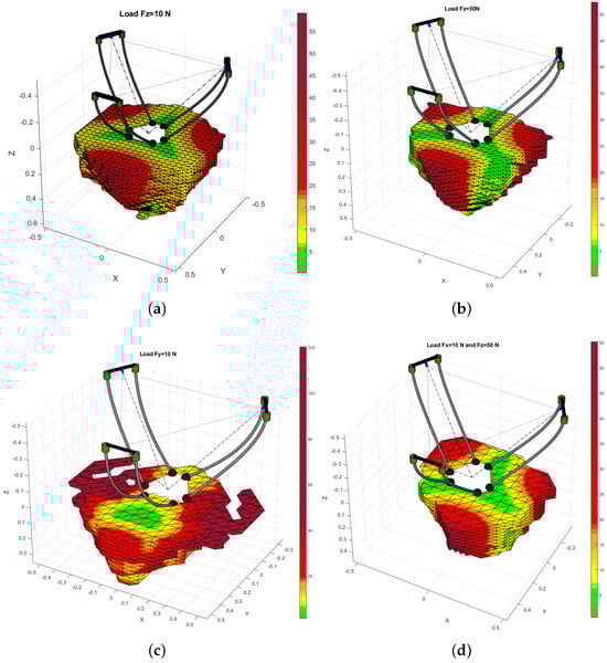 Load influence on workspace of flexible Keops-Delta: (a) N; (b) N; (c) N; (d) N and N.