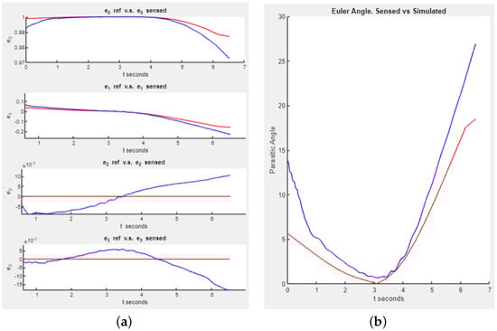 Motion along X-axis: Theoretical (red) vs. Sensed (blue); (a) Quaternions; (b) Euler angle.