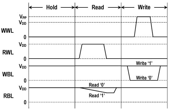 The voltage waveforms depicted in Figure 2 explain the operating principle of the 3T cell. During the standby, RWL and WWL are grounded while both WBL and RBL are precharged to VDD. This hold condition turns MW and MR off, thus storage in the DN is preserved. To read the stored information, RWL is raised to high while WWL is grounded. If DN is low, MS is in the off state; hence, RBL is kept at VDD. If DN is high, MS is turned on; thus, a read current from RBL flows to the ground. This lowers the RBL level. Two different RBL levels are detected by a voltage sense amplifier (SA). To write a datum on the cell, WBL is driven to either low or high while RWL is grounded. WWL is then boosted to VPP which is higher than the supply voltage. This allows a new datum from the write-bitline to be fully written to DN through the high VTH write-transistor.