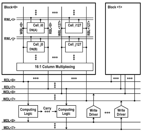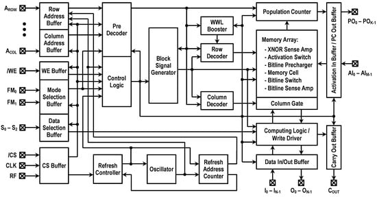 In particular, the embedded gain cell DRAM (GCDRAM) is one of the prospective candidates to realize the CIM scheme, owing to its compatibility with standard logic CMOS process and compact bit cell area. Despite the relatively short retention time of the embedded gain cell itself, the prior GCDRAMs [48,49,50,51,52,53] achieved better area efficiency and much smaller standby power dissipation compared with 6T or read-decoupled (RD) 8T SRAMs. In addition, recent GCDRAM-based CIM works [54,55,56,57,58,59,60,61] have demonstrated the multiply-and-average (MAV) or multiply-and-accumulate (MAC) computations within the gain cell array. They improved substantially both power consumption and throughput in processing the deep neural networks (DNNs). In this work, we propose another GCDRAM-based CIM unit, called the digital computing gain cell DRAM (DC-GCDRAM). The proposed DC-GCDRAM array supports three modes of operation: memory mode, logic–arithmetic mode, and convolution mode. In the memory mode, the DC-GCDRAM works as a usual DRAM compatible with standard CMOS technology. In the logic–arithmetic mode, the proposed architecture performs bit-wise Boolean logic as well as arithmetic computations on operands stored within the memory array. In the convolution mode, the proposed DC-GCDRAM executes the binary XNOR-and-accumulate (XAC) operation on weights stored within the cell array and external input activations. This full-digital CIM unit maintains high circuit reliability. It effectively eliminates the analog design issues such as data conversion overheads and computing accuracy loss caused by process variations. All of the results were obtained using 45-nanometer generic CMOS technology.