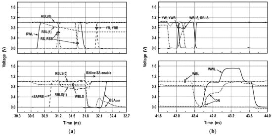 Simulations for memory operation (VDD = 1.0 V, room temperature): (a) read-waveforms and (b) write-waveforms. Here, the signal names are denoted in the circuit schematic shown in Figure 5, BSAOUT denotes the block SA output within the computing logic, and DN represents the data node of the memory cell. In addition, RBL(1) and RBL(0) denote the read-bitline signals corresponding to data ‘1’ and ‘0’, and RBLS(1) and RBLS(0) represent the RBLS signals corresponding to data ‘1’ and ‘0’, respectively.
