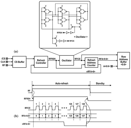 Refresh scheme: (a) circuit configuration for auto-refresh and (b) internal timing.
