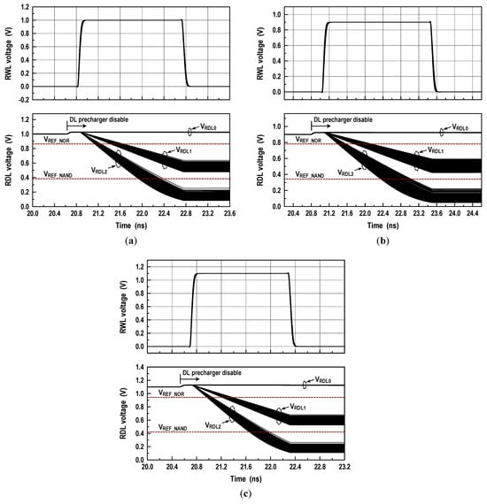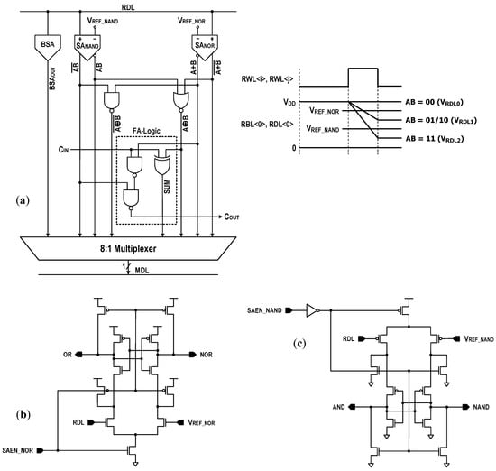 The logic–arithmetic operation begins by turning on the RBL switches and the read column gates after the BL and dataline (DL) prechargers are disabled. Then, two RWLs (RWL<i> and RWL<j>), which correspond to the memory cells storing operands ‘A’ and ‘B’, are activated. Depending on the status of the operands, the RDL will discharge, as shown in Figure 9, at three different levels. If AB = 00, the RDL does not discharge. Hence, the corresponding RDL voltage (VRDL0) is VDD. If AB = 10 or 01, one bit discharges the RDL. The resulting RDL voltage is VRDL1. If AB = 11, the RDL discharges more quickly, resulting in a lower RDL voltage (VRDL2). Comparing the RDL level against a NOR reference voltage (VREF_NOR) with the NOR-SA (SANOR) generates the NOR/OR results. Simultaneously, comparing the RDL level against a NAND reference voltage (VREF_NAND) with the NAND-SA (SANAND) produces the NAND/AND results. Moreover, the XOR operation is implemented by wiring the NOR and AND results to a NOR circuit. Similarly, the XNOR result is obtained by wiring the NAND and OR results to a NAND circuit. In addition, these Boolean logic primitives permit a full adder (FA) to be realized. A traditional FA produces SUM and carry-out (COUT) by adding three input operands A and B and carry-in (CIN). The Boolean equations for the SUM and carry-out can be expressed as follows: