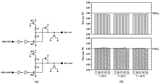where VOS is an offset voltage of the latch-isolation NOR/NAND-SAs in Figure 9b,c. In this design, we set the target levels of VREF_NOR and VREF_NAND to 0.86VDD and 0.38VDD as shown in Figure 11. In Figure 12a, we show the reference circuits for the NOR/OR and NAND/AND operations. They form a ratioed circuit with two resistors. When the control signals (VREN_NOR, VREN_NAND) transit from low to high, the VREF voltage levels are simply determined by the ratio of two poly-silicon resistors: and where the equivalent resistances of transistors MP1, MN1, MP2, and MN2 are negligible. To obtain robust reference levels, the resistors were sized carefully across all specified temperature and process variations. Figure 12b shows the simulated characteristics of the VREF_NOR and VREF_NAND generators for temperature variations (−40 °C, 25 °C and 85 °C) as well as all possible process corners including skewed FS and SF. At the 1.0 V supply, the relative errors between the reference targets (0.86VDD and 0.38VDD) and generated voltages are less than 0.35% for VREF_NOR and 0.53% for VREF_NAND. In Figure 13, the 2500-point Monte Carlo simulations for the NOR/OR and NAND/AND outputs are shown for the three possible cases (AB = 00, 01/10, and 11). The functional results are all correct with the proposed reference scheme.