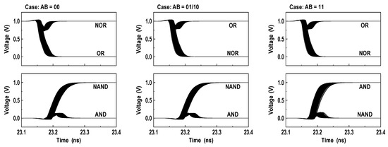 Monte Carlo simulations for NOR/OR and NAND/AND outputs. VDD = 1.0 V; T = 25 °C; 2500 iterations.