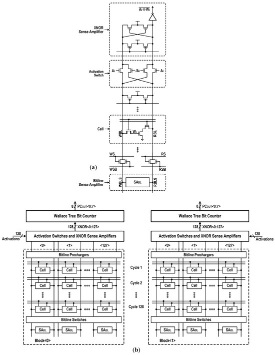 In Figure 15, we show how the configurable DC-GCDRAM perform the XAC operation for BNNs. The memory array composed of 3T cells stores network weights (Wi) in a binary format. Activation switches [34] in Figure 15a, controlled by the input activations (marked with Ai and /Ai in a complementary style), connect a pair of bitlines to a bit-wise XNOR-SA. Thus, an XNOR result between Wi and Ai can be calculated during a read access. Figure 15b represents a simplified configuration to illustrate how the DC-GCDRAM executes the XAC operation. For each operating cycle, two rows (one from each 16-kbit array) are activated by enabling their RWLs. After the BL-SAs (SABL) are fired, the XNOR-SAs compute the bit-wise XNORs between activations and weights, and then the results are forwarded to the bit counters to carry out the population count operation. Each counter takes 128 bit inputs and generates an 8-bit count as output. Although this digital architecture has a limited throughput compared to the analog XAC implementations which activate all their rows at once [18,19], this approach does not need analog-to-digital converters incurring huge area/power overhead and provides extremely accurate computation results even with process–voltage–temperature (PVT) variation.