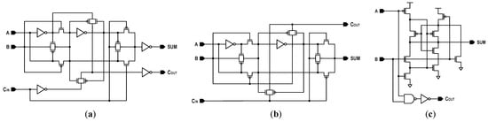 CMOS adder circuits: (a) 22T full adder (FA_22T); (b) 16T full adder (FA_16T); (c) 15T half-adder (HA_15T).