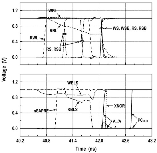 To verify the operation of convolution mode within the DC-GCDRAM array, circuit-level simulations have been performed for all XAC combinations. The simulated waveforms shown in Figure 18 plot the results for the case when both 128 network weights and 128 input activations are all logic-high. The convolution operation, similar to the read operation of memory mode, begins by pulling RWL up to a high level after the BL and XNOR-SA prechargers are disabled. At the same moment, WBLS and RBLS are initially precharged to VREF and VDD, respectively, and then floated by raising nSAPRE to high. Triggering RS and RSB forwards the RBL signal, which depends on the status of weight, to RBLS. Then, the RBL switches are disabled, and the BL-SAs are fired. After RWL is returned back to a low level, both WBL and RBL switches are turned on to reflect the value of weight onto WBL and RBL in a complementary format. Afterward, the activations in a complementary format, which come from the activation input buffers, are developed at the gates of the activation switches. This allows the XNOR-SAs to compute the bit-wise XNORs between weights and activations and to send the results to the Wallace tree bit counter. The latency from RWL to the bit counter output (PCOUT) measures 1.98 ns at 1.0 V supply.