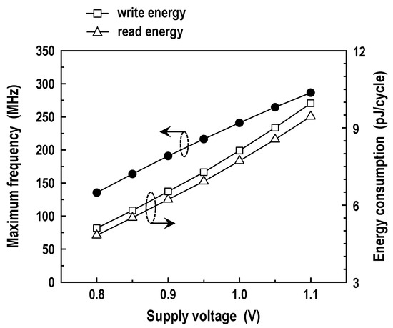 In Figure 19, we have shown the maximum frequency and energy dissipation of the memory operation from 1.1 down to 0.8 V. The energy consumption here represents a whole energy wasted in bitlines, datalines, main datalines, wordlines, decoders, BL-SAs, BSAs, write drivers, WWL booster, predecoders, control logic, I/O buffers, and other peripheral circuits. The simulations are consistent with the predictions; reducing the supply voltage brings about longer delays and lower energy consumption. For the supply voltage of 1.0 V, the DC-GCDRAM functions at 241 MHz with write and read energy figures of 8.12 and 7.72 pJ/cycle, respectively. The write energy is 5.2% higher than the read energy because of the WWL boost.