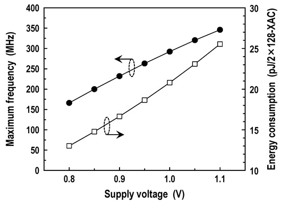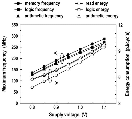 The operation of the logic–arithmetic mode is alike to the read operation in the memory mode, but the difference is that two RWLs are activated at the same time and two binary logic SAs are used in the logic–arithmetic mode. In Figure 20, we show the simulated frequency and energy consumption across the supply voltage for the logic (NOR/OR, NAND/AND, XNOR/XOR) and arithmetic (SUM, carry-out) operations between two words in two rows at room temperature. As VDD decreases, the energy dissipation and the frequency of both operations are reduced. The logic operation, in general, consumes higher energy than that dissipated by the memory read operation due to activations of two rows and two SAs. The latency of logic operation is about 5% longer than that of the memory read operation. Compared with the logic operation, the arithmetic operation has a slightly longer delay and slightly worse energy consumption because of a few additional logic gates. At VDD = 1.0 V, the maximum frequencies for the logic and arithmetic operation are 229 and 224 MHz, and the energy consumptions measure 8.09 and 8.19 pJ/cycle, respectively. Using the simulation results in this study, we compared CIM with conventional digital computing, which reads two words for two memory cycles and calculates them within ALUs, in Figure 21. For the arithmetic (FA) operation at 1.0 V supply, it is estimated that the proposed CIM architecture saves energy and latency by at least 47% and 46% compared with the conventional digital hardware.