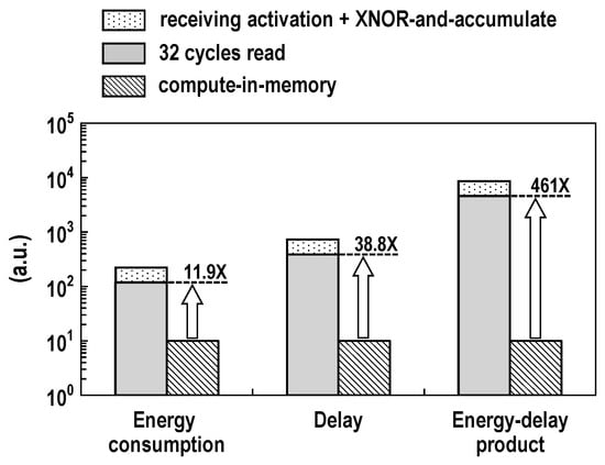 We also evaluated the energy wasted by the binary XAC operation under a range of conditions. In the convolution mode, the total power or energy consumption of the DC-GCDRAM much depends on the bit-wise XNOR results. This is because the outputs of the XNOR-SAs are initially all tied to the ground. The CIM macro computes two independent 128-input XACs in one cycle. Thus, the weights and activations which correspond to two XAC values being 128 each is the worst case for power consumption. Under this worst case, we evaluated the energy dissipation and frequency across the operating voltage as shown in Figure 22. The energy consumption and maximum frequency increase with the supply voltage. At 1.0 V and room temperature, the CIM macro takes 3.42 ns and consumes 20.8 pJ for two 128-input XAC operations, reaching an efficiency of 24.6 TOPS/W. Using the evaluation results in Figure 19 and Figure 22, we compared the proposed CIM architecture with conventional digital computing in Figure 23. For two 128-input XAC operations at 1.0 V supply, it was estimated that the proposed CIM macro obtains at least 11.9× higher energy efficiency, improves the delay by at least 38.8×, and thereby achieves at least 461× better energy-delay product compared with the conventional 8-bit wide digital hardware, which reads 256 weights byte-by-byte; receives 256 activations, also byte-by-byte; and eventually accumulates two XAC values over 32 cycles.