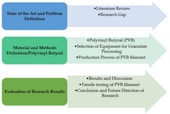 As mentioned in the Introduction section, the possibility of the application of several divergent materials in additive manufacturing is remarkable [10]. Undoubtedly, the technology of additive manufacturing is ongoing nowadays, and not only the technology but everything that comes together in general will definitely be ongoing in the future [11]. The cross-connection of this technology into almost every industry forms opportunities for diverse studies that can be conducted in this field [12]. The proposed research points out the connection between additive manufacturing technology and the application of specific materials, such as polyvinyl butyral (PVB). PVB has significant mechanical properties, which are the study’s main subject of investigation. The proposed paper’s overall methodical steps are depicted in Figure 1, in which decisive chronological steps are briefly outlined. The work’s introduction focuses on the filament’s current state and production process using the extrusion method. The filament production process consists of several steps that must be completed [13]. Therefore, the study points out the optimization of production. A further part of the manuscript is focused on thermovision diagnostic measurement using a thermal camera during the extrusion process and the basic definition of selected terminology in specific areas [14]. The following part of the work is applied to the practical section, in which the non-contact measurement of a particular electrical machine extruder is performed. The measurement can be evaluated in which way and how the temperature affects the extrusion process.