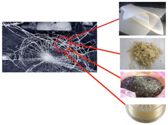 Car windshields are composed of two types of bent sheet glass, between which a foil is glued for increased glass safety [14]. The foil that fulfills the safety function is polyvinyl butyral; it prevents fragments from getting inside the car in an accident and breaking the windshield, thereby not endangering the car crew. The PVB structure is built up of approximately 81% polyvinyl butyral, 18–23% polyvinyl alcohol, and less than 1% polyvinyl acetate. PVB film is characterized by extreme strength, adhesion, and flexibility [15]. The technological process of waste windshield processing begins with loading into the processing line through the loading part with a loader. With the help of conveyors, the material reaches the equipment, removing unwanted substances. Physical and mechanical processes gradually remove unwanted elements, such as dirt, from the shards [16]. The foil remains separated in this way. As mentioned above, glass without foil is a 100% recyclable raw material. Glass granulate is an output raw material for the recovery of glass and is further used as an input raw material in the glass industry, replacing glass sand [17]. The raw materials created in this way form a significant part of the input raw materials that save the environment. Their environmental impact is minimal, so they currently play an important role in selecting suitable raw materials for input. Recycled PVB is obtained from car windshields by separating the PVB foil. The glass is then shredded using a cylindrical branch crusher [15]. Further size reduction occurs in a clad mill, in which the PVB foils are ground to a smaller size of approximately 20 cm2. After separating the materials using vibrating machines, impurities are removed. Recycled PVB for consumers is available as PVB flakes, PVB granulate, PVB foil, and PVB filament [16]. The recyclability of polyvinyl butyral as a raw material upholds the fundamental principles of the circular economy. The following Figure 2 shows recycled PVB in four different forms.