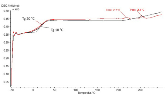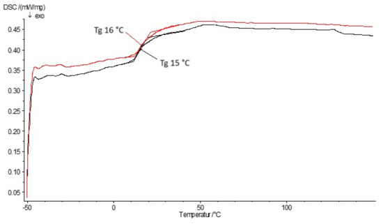 The difference between the first and second heating (Figure 4) can be seen from the graphical representation obtained through the evaluation program NETZSCH Proteus, version 6.0, Germany. It means that the imprecise sample settles in the test aluminium container during the first warm-up. In the second case of heating, the final analysis of the material was obtained. The red color describes recycled polyvinyl butyral (1st heating), and the black colour is for recycled polyvinyl butyral (2nd heating).