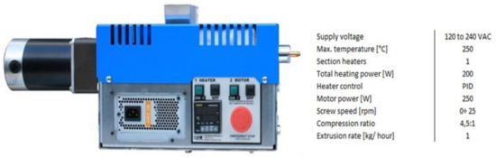 This section applies to selecting appropriate equipment for filament production and its basic attributes. As mentioned above, the extruder is chosen for filament production [23]. This electrical device is used for granulate processing to fabricate filament from recycled granulates. The filament production itself begins when the pellets are poured into the pellet’s hopper, and then the pellets are fed into the extrusion screw [24]. The pellet extruder has several heating zones; in the first part of the extrusion screw, the temperature is usually higher to ensure uniform material melting [25]. The operational rotational speed range of the device used for extrusion is 5–25 rpm. Considering the nature, properties, and potential deformations that may be caused by the discontinuous winding of PVB material, an initial/optimal speed of 15 rpm was determined. This rotational speed of the extrusion screw, along with the speeds of other device components, such as the feeder and winder, ensured the ideal tension of the filament during extrusion and minimised the occurrence of deformations in the cooling zones during the initial phase, specifically at the start of extrusion and the initial winding of the produced filament. It is important to note that the device is equipped with an optical diameter control system. This optical sensor/micrometer is located before the feeder and continuously monitors the filament diameter along one axis. In the event of a deviation greater than the calibrated value, automatic corrections to the extrusion speed, feeder, and winder are made. When pellets are melted into the desired liquid, the movement of the auger screw builds up the pressure at the end part of the extruder, where the melted plastic is pushed through the extruder nozzle. A FilaFab Pro EX350, D3D Innovations Limited, Poole, UK (Figure 5) extruder was chosen for the experimental part of the proposed study. The Filafab 350EX, D3D Innovations Limited, UK, extruder features a single zone where the filament is melting. Due to its design, the manuscript mentions shortcomings associated with the unintentional heat spread toward the hopper. This single heating zone is adequate for extrusion and filament production. However, for PVB material, the cooling of the extrudate proved to be more challenging, requiring cooling at multiple points. Rapid and abrupt cooling, such as in a standard water bath, caused deformations during extrusion, while slower cooling led to material deformation by the feeder. A multi-zone active cooling system was designed to extrude PVB material to address these issues. This approach prevented internal stresses, filament deformation in the neck area at the nozzle exit, deformation caused by the feeder, and other undesirable effects. As shown in the following figure, the maximum operating temperature of the extruder is 250 °C.
