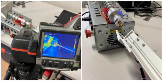 Before filament fabrication starts, it is necessary to ensure the proper extrudepreviously previously previously used. This step is crucial for the resulting quality of the produced filament. As was suggested before, proper material drying before extrusion is an essential part of the whole process. Based on the experiment, we recommend drying the material for at least three hours. If these steps are successfully performed, it is possible to start the extrusion process [28]. The extruder has to be heated up at the required temperature. Filament yarns were extruded at different temperatures to reveal the optimal extrusion temperature for the chosen material. The first group of specimens was made at a temperature of 175 °C for extrusion. Then subsequent groups were made at 160 °C, 155 °C, and 150 °C, and the last group of specimens was extruded at a temperature of 140 °C. Figure 6 represents the process of filament production and measurements taken using a thermocamera.