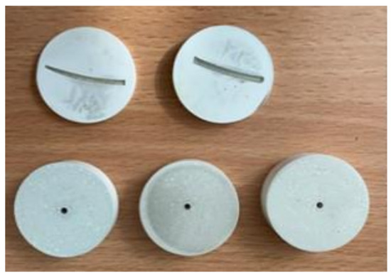 In this case, the temperature of 155 °C appeared ideal for extruding fibers from this material. The temperature of 140 °C was already too low, the diameter of the material was not constant, and there was clogging of the nozzle and even fiber breakage. The subsequent verification of the established temperature was carried out using microscopic images. For this purpose, two sets of samples were selected. The first series consists of the following extremes: the highest and lowest extrusion temperatures [22,27]. These were intended to demonstrate the additional negative impact observable in cases of negative or positive temperature extremes. The second series of samples comprise temperatures of 160, 155, and 150 °C, which appeared ideal upon simple visual inspection during and after extrusion. Considering that the filament itself, with a diameter of 1.75 mm, cannot be processed to a level at which individual defects are observable at the required level, the samples were prepared in advance—preparation involved embedding the samples into a casting resin commonly used for materials microscopy [28]. Three types of casting resins were gradually selected. Two of them were excluded due to insufficient filament visibility or defects arising during casting and a chemical reaction with the PVB material, resulting in material dissolution before the solidification of the casting resin. Figure 6 shows the preparation process of PVB filament samples, which were cold-hardened into acrylic resin Durocit. Samples were cold-hardened for better manipulation and stability during the observation under the microscope (Figure 7).
