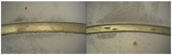 For a successful series of prepared samples, it is possible to declare the samples visible in Figure 8. The casting material DuroCit-3 was utilized for this purpose. The material did not chemically react with the material used, and sufficient color contrast was ensured between the observed sample and the casting material [27]. Given these results, the prepared samples were utilized to generate microscopic images. The Keyence VH-ZST device was employed to create microscopic images. As depicted in Figure 8, two images of the deformation of the extruded filament in the longitudinal direction were initially generated. These clearly illustrate two types of deformations in the case of incorrect extrusion temperature settings. Figure 8 displays a sample created at a temperature of 140 °C. Across the entire surface of the sample, visible irregularities are caused by the low extrusion temperature and discontinuous material feeding from the nozzle. The second image (Figure 8) represents a so-called “overcooked” sample extruded at a temperature of 170 °C. Its surface is notably smooth but contains small pores, which were created literally by the material overheating and the evaporation of the moisture contained within. These samples were deliberately produced at extreme temperatures to elucidate better the negative effect caused by incorrectly chosen temperatures.