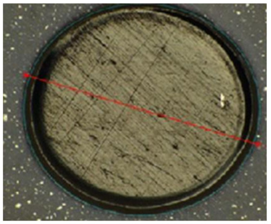 The next series of samples consists of cross-sections perpendicular to the extrusion axis. Essentially, this represents the previously mentioned verification of the phenomenon in which higher temperatures result in diameter deformation of the extruded filament. For this purpose, samples from the temperature range of 160 to 150 °C were employed. These samples appeared optimal during visual inspection and continuous diameter measurement during extrusion [27,28]. Microscopic images were utilized to finalize the ideal temperature, considering the filament’s diameter deformation, as mentioned above. This deformation can be relatively easily identified in such images through a visible change in the shape of the fiber’s cross-section from circular to elliptical. Through microscopy, the filament manufactured at a temperature of 150 °C was identified as ideal. As depicted in Figure 9, the filament exhibits an ideal circular cross-section, and the diameter (red line) of 1.75 mm (±0.06 mm) size corresponds to the commonly adopted diameter of fibers utilised in most FDM devices.