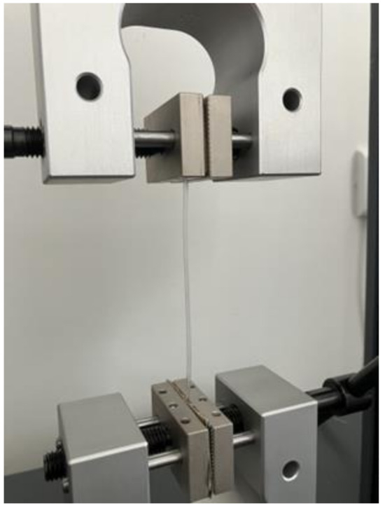 Tensile testing was performed on a specific device, TestometricX350-5, Testometric Company Ltd., Oldham, UK according to standard DIN 527-1. The diameter of the produced filament yarns corresponds to 1.75 mm. A total of five groups of measurements were taken, and every group consisted of six specimens as stripes. Tensile testing was performed to specify which extrusion temperature is optimal for the best material characteristics of filament yarns [17,29]. The TestometricX350-5 device is a tabletop, two-column, computer-controlled universal testing machine for testing materials in tension, compression, bending, cyclic loading, adhesion, shear, hardness, and spring testing. A modern and functional design, the latest control electronics, and high-quality processing characterize the machine. The electronics are placed on silent blocks for protection against impact during tests. The machine is controlled using the modern Wintest Analysis software running on the Windows operating system [27]. The software is fully configurable and allows for the setup of simple and more complex multi-step test methods. WinTest Analysis software, EC 6.2.5 is a complex system working on the Windows operating system. It is fully integrated and fully customizable software that supports the creation of test programs according to ISO, EN, ASTM, ČSN, STN, DIN, BS, and other standards, including internal procedures and researchers’ own specifications for testing materials [28,30]. With the help of this software, it is possible to perform all the aforementioned tests on the machine. The software allows for the setup of simple tests for normal material testing. For development or research needs, there is a possibility of setting up multi-stage loading. The used device, Testometric X350-S, measured mechanical properties more precisely for performing a mechanical tensile test [31]. The load capacity is 5 kN, the feed rate is from 0.00001 to 2000 mm/min, the height (without jaws) is 1100 mm, the width is 320 mm, and the measuring range is from 0.4% to 100% of the nominal value of the load [32]. The tested samples were made in a stabilized environment; each sample had a constant length of 160 mm and a diameter of 1.75 mm. Standard jaws equipped with preparation for the possibility of attaching the fiber were used for the tests [33]. A sample of PVB filament with a diameter of 1.75 mm at a temperature of 140 °C is clamped in the jaws of a Testometric X350-5 tearing machine (Figure 10). A tensile test was used to evaluate the material’s tensile strength [34]. The test’s principle stressed the test body until the sample ruptured. The test sample was clamped in the jaws of the tearing machine [35]. Due to the constant speed, it was stretched [29]. Along with the increasing deformation, the force needed to maintain a continuous speed of the displacement of the jaws of the tearing machine also increased [36]. Parts of the sample are still attached in the jaws of the tearing machine, which are taken out after loosening the screws that hold the sample.