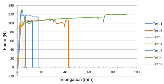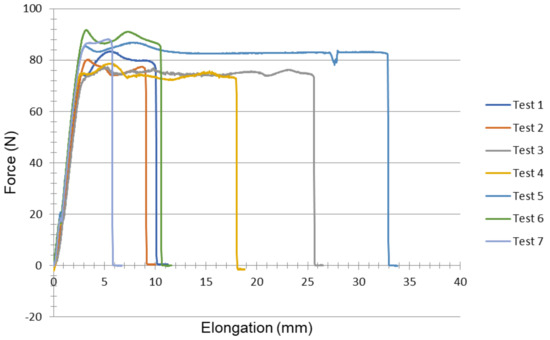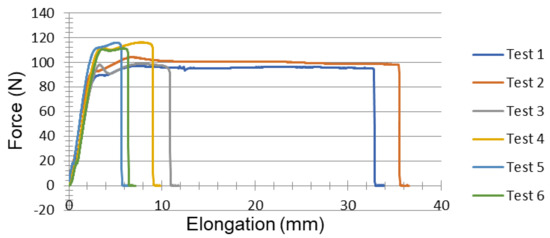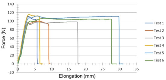 Figure 13 shows a tensile test of PVB filament at a temperature of 155 °C. The tested samples were subjected to a force stress of 50 mm.min−1. In principle, the permissible load of the measuring head for force sensing must meet the range for the type of material being tested, which, in the case of polymers, represents a range from approximately 500 N for rubbers to 25 kN for very strong materials [39]. A visible change is in the relative elongation, which, at a temperature of 155 °C, shows values from 3.096% to 16.725%.