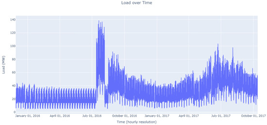 The first step involved collecting historical electrical load [23]. This dataset includes various features that could influence load patterns, such as the time of day, day of the week, seasonal variations, and economic indicators. The data were then split into training and testing sets to evaluate the performance of the models. In some cases, the AutoML frameworks themselves performed the train–test split based on their internal algorithms to ensure optimal model training and evaluation. These data were selected due to the unpredictable behavioral patterns of an industrial load profile, making this profile a suitable candidate to test the robustness of the forecasting models. For simplicity, the data are treated as univariate.