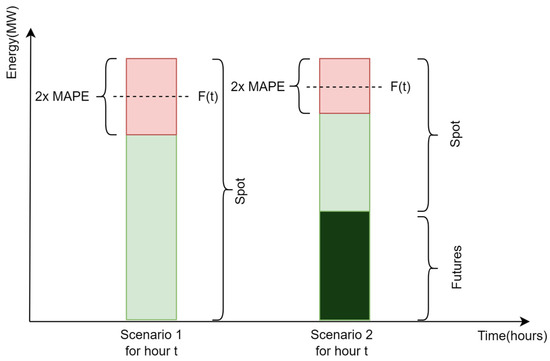 In this scenario, the strategy aims to minimize costs without minimization of the risk, using Futures contracts. These financial assets offer the securing of energy quantities at a fixed price for a dedicated amount of market time slots. The energy retailer buys an amount of energy in the Futures Market, , and the remaining amount is exposed to the volatile Spot Market as . The total energy demand for hour is .