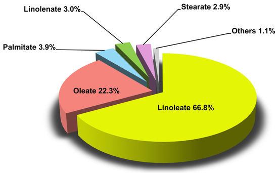 The FAME profile of WCOBD after the first transesterification of WCO is shown in Figure 2. As observed, methyl linolenate is the main FAME, accounting for 66.8%, followed by methyl oleate (22.3%), palmitate (3.9%), linolenate (3.0%), and stearate (2.9%). Other studies included similar FAME profiles, with the main composition differences related to the two main FAMEs (that is, methyl linoleate and oleate) [,]. This could be due to the fact that WCO composition depends on the culinary traditions of each area or circumstance; apparently, sunflower oil prevailed in this study (at the expense of olive oil) as the typical vegetable oil in this region.