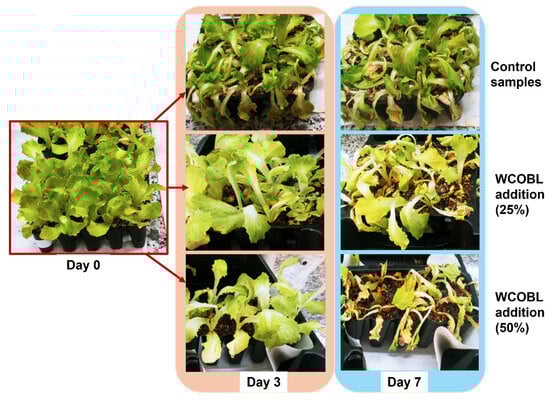 Regarding WCOBL, its phytotoxicity applied to lettuce was assessed, including the main results in Figure 3 and Figure 4. Firstly, visual degradation of control samples was clear on Days 3 and 7 (due to the lack of watering since Day 0), with slight differences shown compared to samples watered with WCOBL (25% and 50%), which were more degraded (especially concerning turgor and yellowing of leaves).