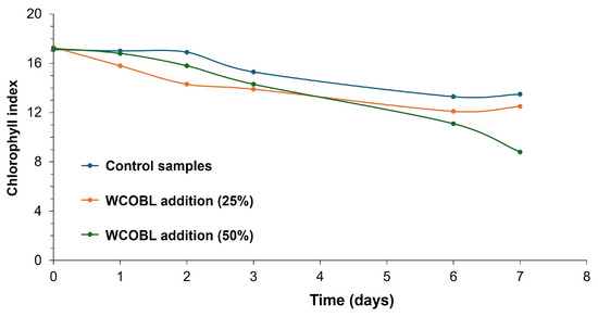 Regarding chlorophyll levels, Figure 4 shows the main results, where there were no considerable differences between control samples (keeping the highest chlorophyll index throughout this experiment) and the addition of 25% and 50% WCOBL. In any case, there was a continuous decrease in this parameter, possibly due to the gradual degradation of lettuce on account of the lack of watering. However, the relatively worse results obtained for WCOBL could be due to the generation of a waterproofing layer. Nevertheless, the higher biodegradability of vegetable oil-based products could explain the low phytotoxicity observed in this case.