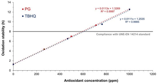 As previously stated, WCOBD and WCOBL required antioxidant addition. Thus, the effect of the separated addition of PG and TBHQ in WCOBD is included in Figure 5. In this sense, both antioxidants presented a similar efficiency, with similar oxidation stability increases at the same antioxidant concentrations. Consequently, both antioxidants allowed compliance with the standard at around 600 ppm. In the literature, there are different results concerning the efficiency of different antioxidants, with better results for PG in some cases [], whereas TBHQ had a better antioxidant performance in other studies [].