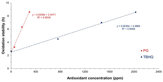 However, this effect was different when PG and TBHQ were added to WCOBL. As observed in Figure 6, PG presented a higher efficiency compared to TBHQ, considerably increasing oxidation stability of WCOBL at lower concentrations. Oxidation stability values of 8 h were achieved at around 200 ppm of PG, whereas the same result was obtained with around 1800 ppm of TBHQ. This specific behavior in biolubricants was observed in previous studies for similar products. Regarding the different efficiency depending on the kind of sample (biodiesel or biolubricant), this could be due to the different nature of these products, where different viscosity, polarity, and acidity values could alter the suitable dissolution and distribution of antioxidants. Indeed, previous studies have covered the possibility of TBHQ chemical modification to improve solubility in biodiesel due to its polarity [], and this fact could be decisive at this point.