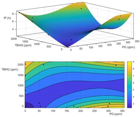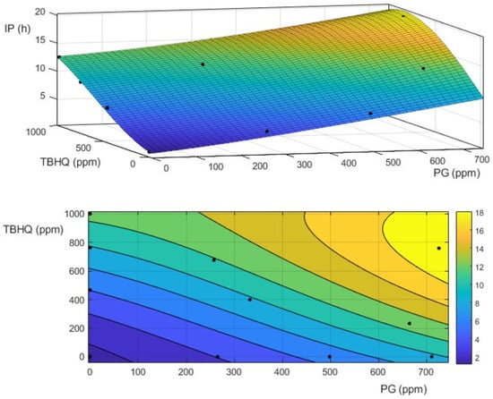 Equally, the mixture of antioxidants showed interesting results, as observed in Figure 7 for the combined effect of PG and TBHQ on oxidation stability of WCOBD. The data included in this experiment were fit to a third-degree polynomial (R2 = 0.98857), according to ten samples with variable PG and TBHQ concentrations (at high, medium, and low concentrations, within 0–1000 ppm for each case). Possibly due to the similar efficiency of both antioxidants (as previously explained), a neutral or additive effect was observed (in general) when PG and TBHQ were combined at different concentrations.