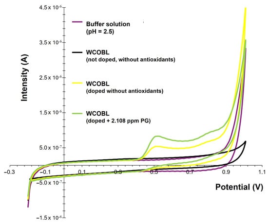 Firstly, preliminary studies were carried out to register different samples, including buffer solution, and biolubricant without antioxidant addition and with antioxidant addition (in this case PG), in order to assess the voltammetric (CV) response. Figure 9 shows the main results.