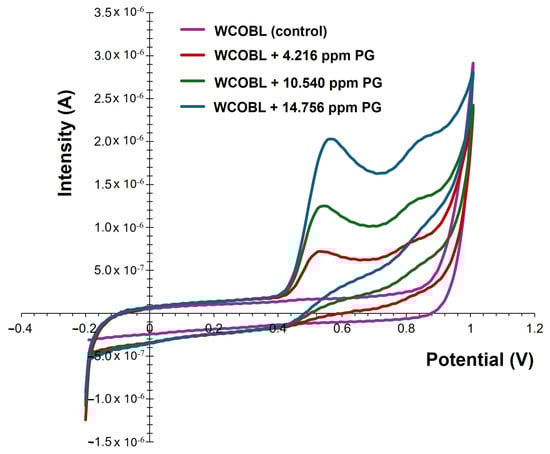 As expected, the signal corresponding to PG (an anodic peak at 0.5 V) increased with its concentration in WCOBL (both peak area and height), with no signal shown in the inverse scanning.