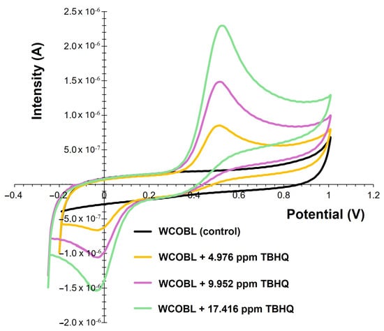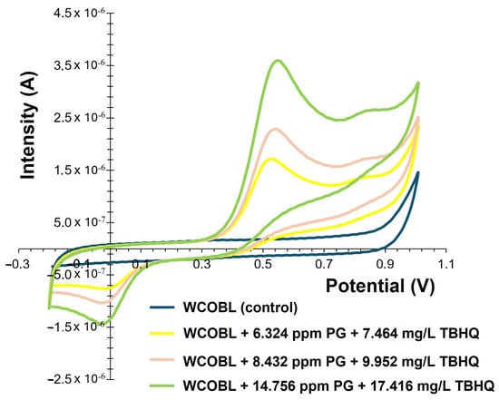 Figure 12 includes the main signals obtained when PG and TBHQ were added to WCOBL. Thus, obtaining the anodic peak of PG + TBHQ, it is possible to correlate the peak area of this figure to the TBHQ signal (Figure 11) to obtain the signal corresponding to PG according to Equations (1) and (2):