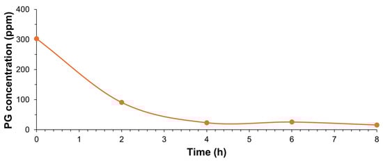 The high quality of the parameters included in this table should be noted (especially with high linearity, obtained at different PG and TBHQ concentrations and conducting the experiments in triplicate), similar to previous studies where TBHQ was quantified in a biolubricant based on WCO, obtained through double transesterification with methanol and pentaerythritol [].